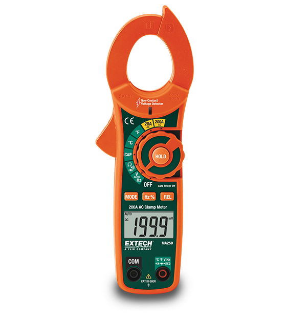 La pinza amperometrica compatta Extech MA250 da 200 A offre ai tecnici della manutenzione, agli elettricisti e agli appassionati del fai da te uno strumento di test che fornisce un alto livello di funzioni a un ottimo prezzo. Oltre a una serie di funzionalità principali di misurazione di corrente e multimetro, è dotato anche di un rilevatore di tensione senza contatto (NCV) integrato. Il cuore dell’MA250 è un multimetro digitale a funzione completa. Le funzioni di misurazione coprono la maggior parte dei tipi di risoluzione dei problemi, oltre alle misurazioni non invasive della sonda di corrente. Ciò include i test di tensione, resistenza, capacità, frequenza, ciclo di lavoro, diodo e continuità. Misura anche la temperatura con la relativa sonda a filo di tipo K in dotazione. Il modello MA250 comprende cavi di test, sonda di temperatura a goccia di tipo K per uso generico, due batterie AAA, custodia da trasporto, manuale d’uso e garanzia limitata di un anno.