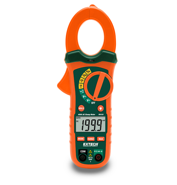 Extech MA430 è una pinza amperometrica compatta da 400 A CA che consente agli utenti di effettuare misurazioni in spazi ristretti. L’apertura della ganascia da 30 mm (1,2 pollici) per conduttori accoglie conduttori fino a 350 MCM. Dotato di un’ampia lettura a quattro cifre, il display illuminato è facile da vedere in aree di lavoro scarsamente illuminate e il selettore a quadrante è posizionato ergonomicamente per un funzionamento comodo e con una sola mano. Le funzioni del multimetro dell’MA430 includono test di tensione CA/CC, resistenza e continuità. Nell’MA430 è integrato anche il rilevatore di tensione senza contatto (NCV). Eliminando la necessità di un tester separato, il rilevatore NCV utilizza un LED rosso per avvisare gli utenti della presenza di tensione sui cavi sotto tensione. Funzioni aggiuntive comprendono mantenimento dati, spegnimento automatico e indicazione di batteria scarica. Comprende cavi di test, batteria da 9 V, custodia morbida da trasporto e manuale d’uso.