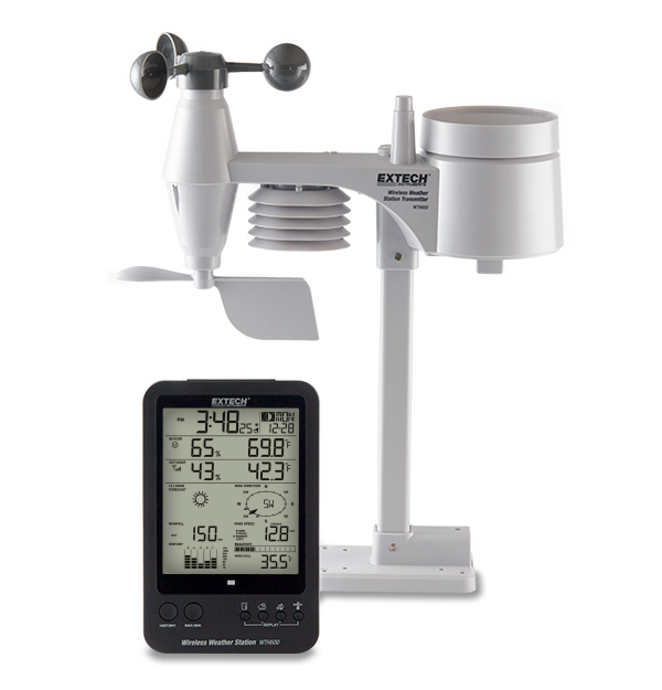 Extech’s WTH600-KIT Wireless Weather Station Kit helps you plan your day to day outdoor activities that may be affected by weather conditions including businesses involved with construction, agriculture, and recreation. The kit includes an indoor Wireless Base Station with a large LCD displaying indoor temperature, humidity, and outdoor weather conditions, plus date and time. It also comes with an outdoor Wireless Transmitter with 5 built-in sensors, including a self emptying rain collector for measuring rainfall, wind cups for wind speed, wind vane for wind direction, and temperature and humidity sensors. It sends data by a low power radio frequency to the Base Sation up to 150 m (450 ft) away. The kit comes assembled for easy installation.