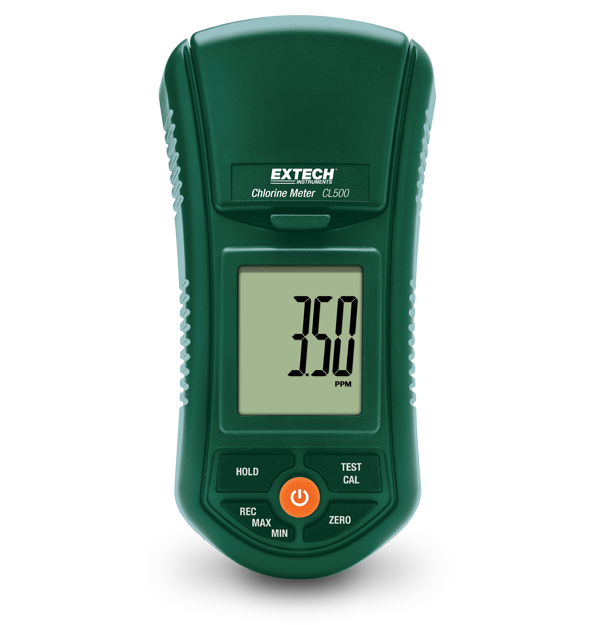 The Extech CL500 is a Free and Total Chlorine Meter. This chlorine tester measures up to 3.50 ppm with 0.01 ppm resolution on its large LCD screen. Complete with free, total and zero chlorine standard solutions, test bottles with covers, free and total chlorine DPD powder (10 pcs), cleaning cloth, 6 AAA batteries, and hard carrying case.