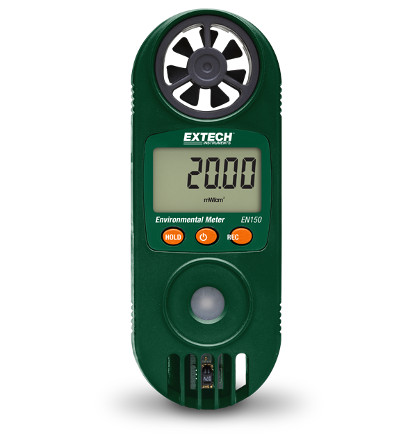 The Extech EN150 is a compact 11-in-1 Environmental Meter wth a UV Light Sensor for indoor and outdoor conditions. Its built-in sensors measure air velocity, air flow, temperature, humidity, wet bulb, dew point, heat index, wind chill, barometric pressure, altitude, and UV light. Its compact design also features a data hold and auto power off function. Complete with built-in multiparameter sensors, wrist strap, and CR2032 battery.