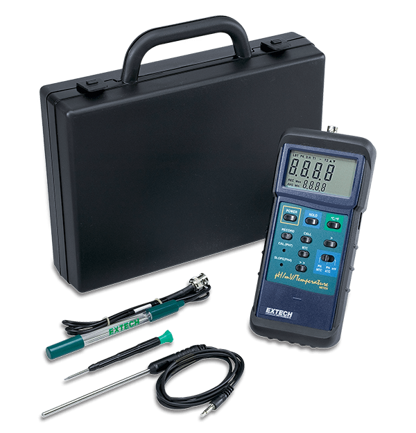 The Extech 407228 is a Heavy Duty pH/mV/Temperature Meter Kit that simultaneously displays all measurements on a large, 3.6 cm (1.4 in) LCD. It features 2 point calibration and slope adjustments, manual and auto temperature compensation, min/max/AVG, auto power off, and data hold functions. A built-in RS-232 interface can be used with the optional data acquisition software and datalogger. Comes complete with mini pH electrode, temperature probe, 9 V battery, protective holster, and case.