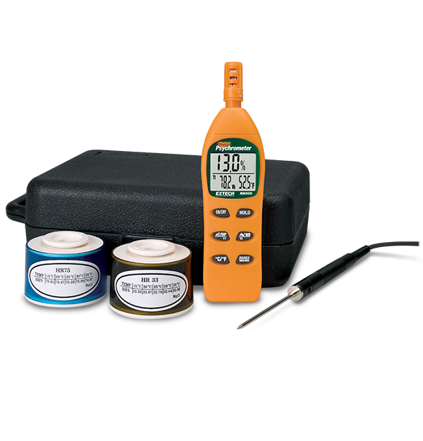 The Extech RH305 Hygro Thermometer Psychrometer Kit includes a RH300 humidity meter, external temperature probe, 33% and 75% humidity calibration standards, and batteries. The meter simultaneously displays relative humidity, air temperature, and dew point or wet bulb. It can also measure external temperature using the temperature probe supplied in the kit. The humidity meter itself is compact, making it ideal for field applications. It also has a unique sensor cap which closes to protect meter during storage. Advanced features include data hold, selectable auto power off, and max/min/average reading. The meter can be calibrated in the field using the 33% and 75% humidity bottles supplied in the kit. A hard case is included for storing the calibration bottles when not in use.