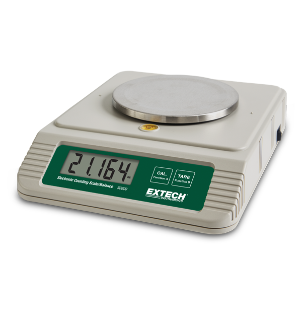 The Extech SC600 is an Electronic Counting Scale/Balance intended for professional electronic counting and weighing with a load cell transducer for high accuracy and performance. The wide capacity measures single small electronic components weighing up to 0.1g (0.005 oz), or in batches up to 600 g (21.164 oz). Complete with 6 AA batteries, metal platform, and Universal AC adaptor with multiplugs.