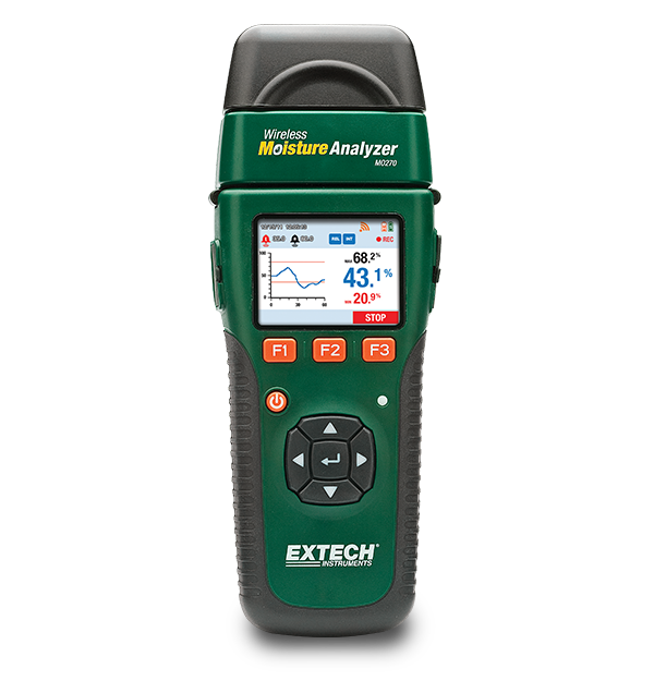 The Extech MO270 is a Wireless Pin/Pinless Moisture Meter with detachable pin/pinless sensors that transmit data to the display, and can be viewed up to 20 m (65 ft) from the measurement point. Measurements are viewed on a full color graphical display. Readings from 8 remote sensors can be viewed on the display. The receiver can record data from 40 remote sensors simultaneously. Trending Mode displays a graphical representation of live readings for fast scanning of large areas. An included telescoping handle extends to 1.2 m (4 ft) for measurements in ceilings or in hard to reach areas (optional 3 m (9.8 ft) and 5 m (16.4 ft) handles available). Complete with 9 V battery, remote pin probe, replacement pins, protective cap, and pouch case.