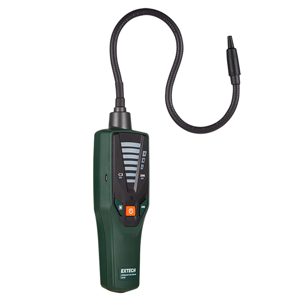 The Extech RD350 refrigerant leak detector features a highly sensitive heated diode sensor. It detects a wide range of refrigerants—including R410A, R32, R134a, and more with a sensitivity of just 3g/year. Its tri-colored LED leak level indicator, variable audible alarm, and flexible 15.5” probe make pinpointing leaks effortless.