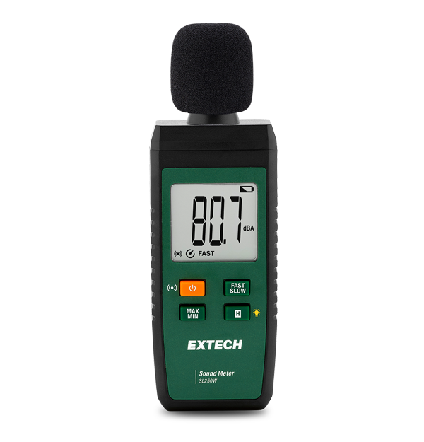 The Extech SL250W is a compact Sound Meter with Bluetooth® connectivity, which allows building and maintenance professionals to view and share sound level data directly from a mobile device using the free ExView® app. With the capability to capture data, display trends, set visual and audio alarms, and send reports, users can gain deeper insights on workplace comfort and public health.