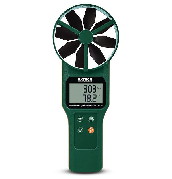 O Extech AN320 é um Anemômetro/Psicrômetro com fluxo de ar CFM/CMM mais CO2. Este medidor calcula a velocidade do ar, fluxo de ar, umidade relativa, bulbo úmido, ponto de condensação e dióxido de carbono. A série de ’termoanemômetros com fluxo de ar da Extech permite leituras mais precisas em dutos de tamanho maior. Inclui as funções mín/máx, retenção de dados e desligamento automático. Completo com mala de transporte e 4 pilhas AAA