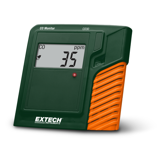 O CO30 da Extech exibe concentração de monóxido de carbono (CO), temperatura do ar e umidade relativa. Ele apresenta um alarme sonoro programável com um bipe de altos decibéis que soa quando a concentração de CO sobe para níveis inseguros. A unidade pode ser montada na parede ou usada em uma mesa perto de áreas de preocupação. Outros recursos incluem um indicador de alarme de LED tricolor (verde, amarelo, vermelho) brilhante visível, uma função de recalibração zero, compensação manual de temperatura e umidade relativa (ajustável), função de calibração de CO em ar fresco e um indicador de bateria fraca. Completo com adaptador CA universal (incluindo plugues dos EUA, UE, Reino Unido e Austrália) e quatro baterias AAA.