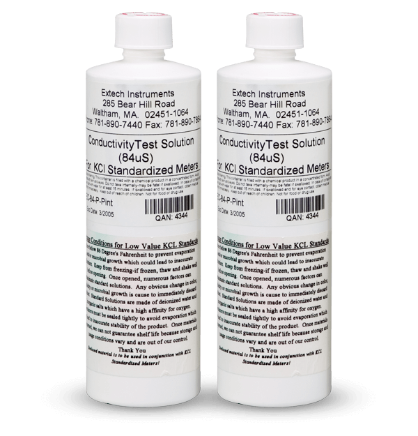 O Extech EC-84-P são duas garrafas da solução padrão de condutividade, 1 litro cada de solução pré-fabricada. O EC-84-P 84 µS é para o uso com medidores de condutividade Extech, como o medidor de condutividade/TDS/salinidade EC400 ExStik ou o kit de condutividade DO610 ExStik II DO/pH/Condutividade.