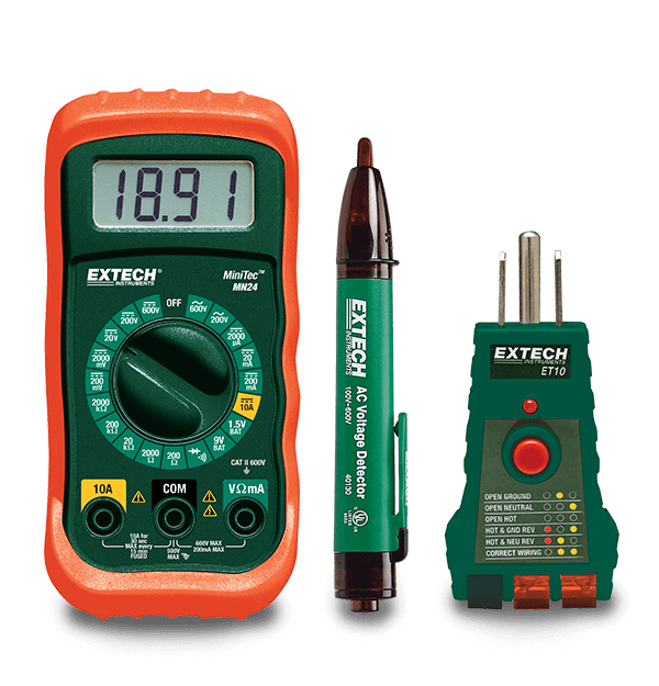 The Extech MN24-KIT is an Electrical Test Kit which provides you with basic troubleshooting tools for common electrical problems. This kit comes with three powerful tools: the MN24 Manual Ranging CAT II-600 V MiniTec Multimeter, the 40130 Non-Contact Voltage Detector, and the ET15 Receptacle Tester. The MN24 is a 7 function mini multimeter that measures AC/DC voltage to 600 V, DC current to 10 A, resistance, and diode/continuity on a 2000 count LCD display. The multimeter takes interchangeable test leads and is housed in a durable casing. The 40130 is a Non-Contact Voltage Detector. This NCV detector is for use on 50 Hz/60 Hz circuits, and it detects AC Voltage from 100 VAC to 600 VAC without the need to touch the source. Detection is indicated by flashing red LEDs. The ET15 is a receptacle tester used to detect faulting wiring in 3 wire receptacles for 5 wiring faults. The ET15 utilizes LED lights to indicate good or bad connections. The MN24-KIT is supplied in an attractive storage case that provides protection and organization for the meters.