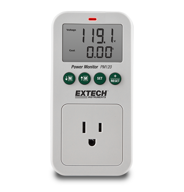 Monitor and record power usage of home and work appliances for energy conservation and cost reduction analysis with the Extech PM120 Power Monitor. This helps you determine if the electrical device should be replaced with a higher efficiency unit. The PM120 has a large dual LCD. The primary display shows voltage, current, power, power factor, and frequency readings. The secondary display shows total time, cost (cost of operation per minute, day, or week), set, or energy. Design includes a standard, North American 3 prong plug, front socket connection, and backup battery that saves customized programs.