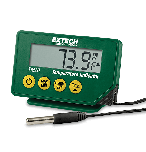 The Extech TM20 is a waterproof Compact Temperature Indicator with a stainless steel probe. It includes 20 mm (0.78 in) stainless steel probe with 2.9 m (9.6 ft) cable. The TM20 measures temperature from -40°C to 70°C (-40°F to 158°F). Complete with foot stand, temperature sensor, and a CR2032 3 V button battery. CE certified.