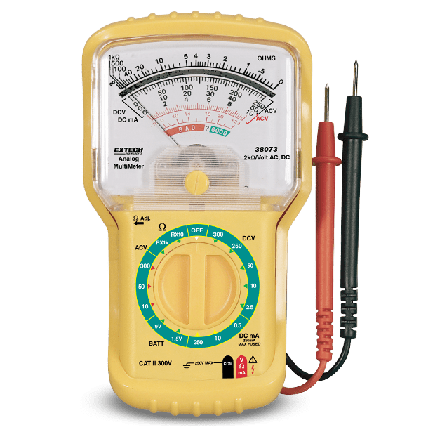 Extech’s 38073 Mini Analog MultiMeter offers the testing advantages of an analog meter with a pocket-friendly size. This compact multimeter is equipped with measurement capabilities that are perfect for a electrical hobbyist, electronics tinkerer, home DIYer, and shadetree mechanic. Useful for illustrating adjustments made to a circuit between relative high and low settings, this meter can be used to perform basic troubleshooting on anything connected to an outlet. Complete with protective holster, test leads, and one 1.5 V AA battery.
