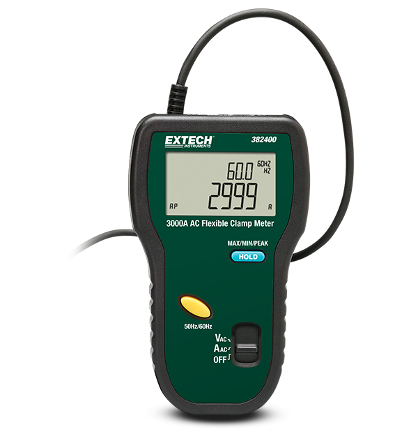The Extech 382400 Flexible True RMS 3000A AC Clamp Meter is a 3000 A AC clamp meter with a flexible, 610 mm (24 in) probe to easily wrap around bus bars and cable bundles. It features an attractive, large LCD displaying AC current, AC voltage, and frequency measurements.