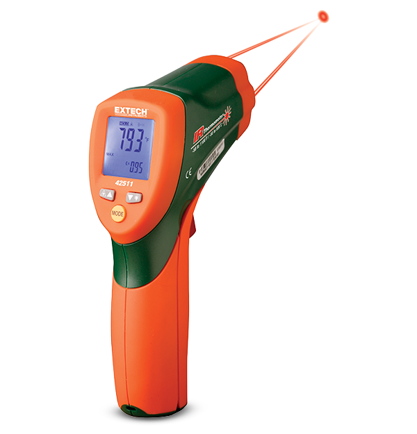 The Extech 42511 is a Dual Laser IR Thermometer. It features a meter which indicates ideal measuring distance and a 12:1 distance to target ratio where two laser points converge to a 2.5 cm (1 in) target spot. it displays continuous and held data on a white backlit dual LCD display. Temperature range from -50°C to 600°C (-58°F to 1100°F). Complete with pouch case and 9 V battery. CE certified.