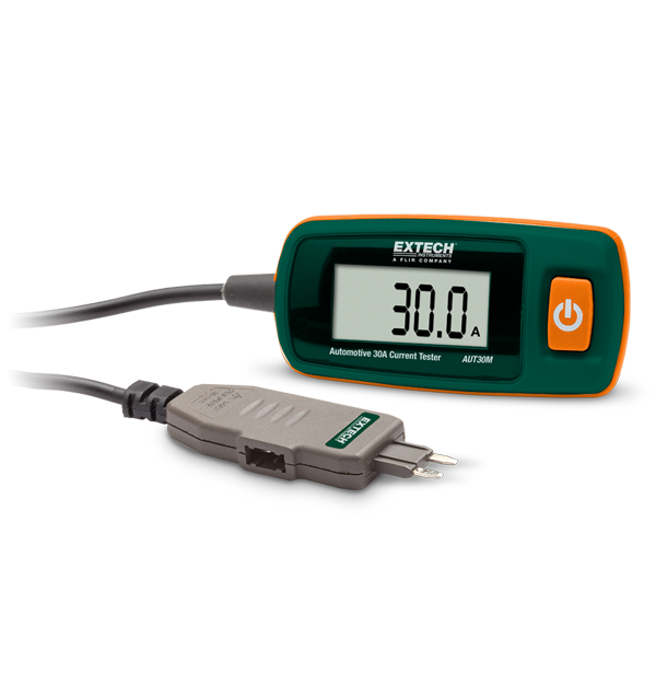 Check up to 30 Amps without breaking the circuit with the Extech AUT30M Current Tester. Mini-blade connectors plug into the fuse block. It has a measuring range of 30 Amps/48 VDC (10 seconds max) with 100 mA resolution and ± a (2% + 2 digits) accuracy. Results are displayed on a 3.5-digit LCD. Includes 71 cm (28 in) connector cable.