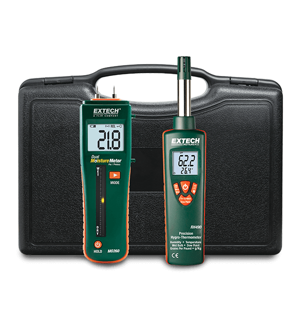 The Extech MO260-RK Restoration Kit features the MO260 Combination Pin/Pinless Moisture Meter and the RH490 Precision Hygro-Thermometer. The MO260 monitors moisture in wood and other building materials with virtually no surface damage. Choose from % WME (wood moisture equivalent), pin moisture reading (6.0% to 94.8%), or relative pinless moisture reading for non-invasive measurements. It has a measurement depth of up to 22 mm (0.75 in) below the surface. The digital LCD readout with backlighting also features a tricolor LED bargraph. The RH490 measures temperature, humidity, dew point, wet bulb, and mixing ratio in GPP (grains per kilogram/grains per pound). It features less than 30 second RH response time with 2% RH accuracy and a dual backlit display. The kit is supplied in a hard carrying case that provides protection and organization for the meters and accessories whenever they are needed.